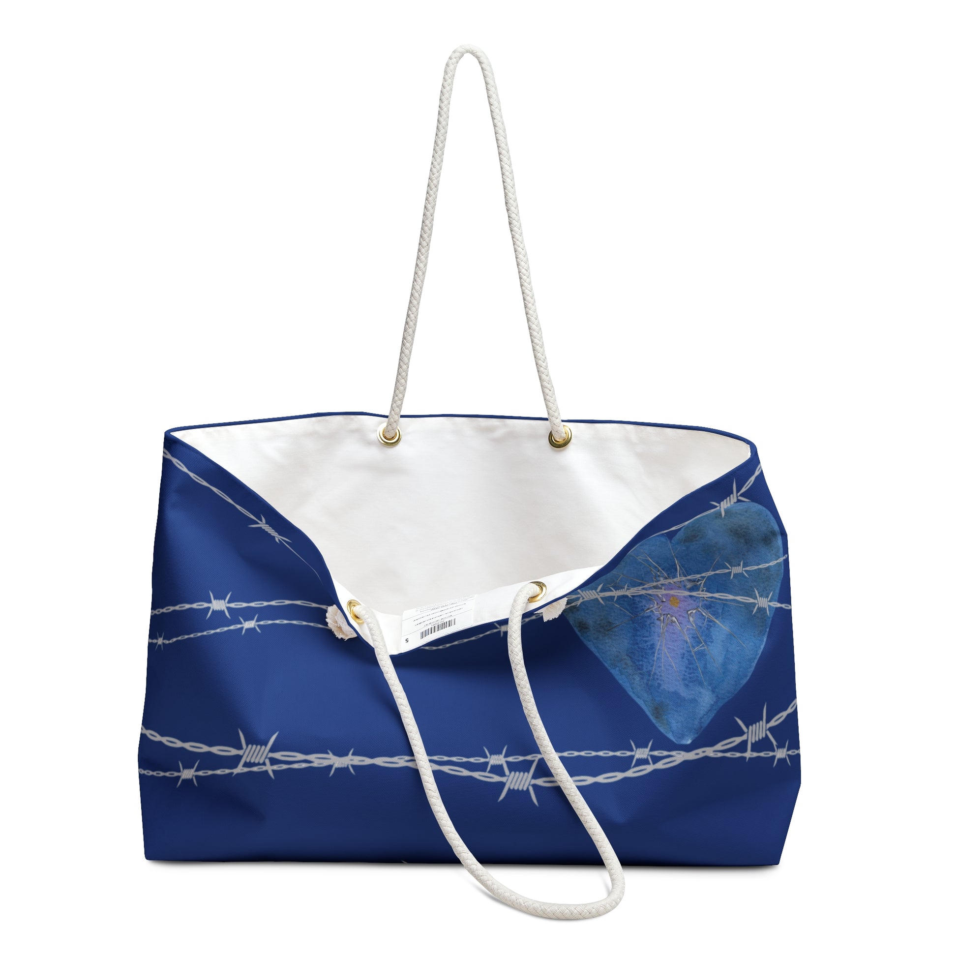 Late-night sky blues and a quiet, rebellious heart—this weekender bag carries both. The deep indigo background sets a calm, contemplative tone while soft barbed-wire lines and a watercolor heart add contrast: protective, defiant, and tender. Big enough for a weekend away, it slips over a shoulder with cream rope handles and keeps contents neat with a structured T-bottom.