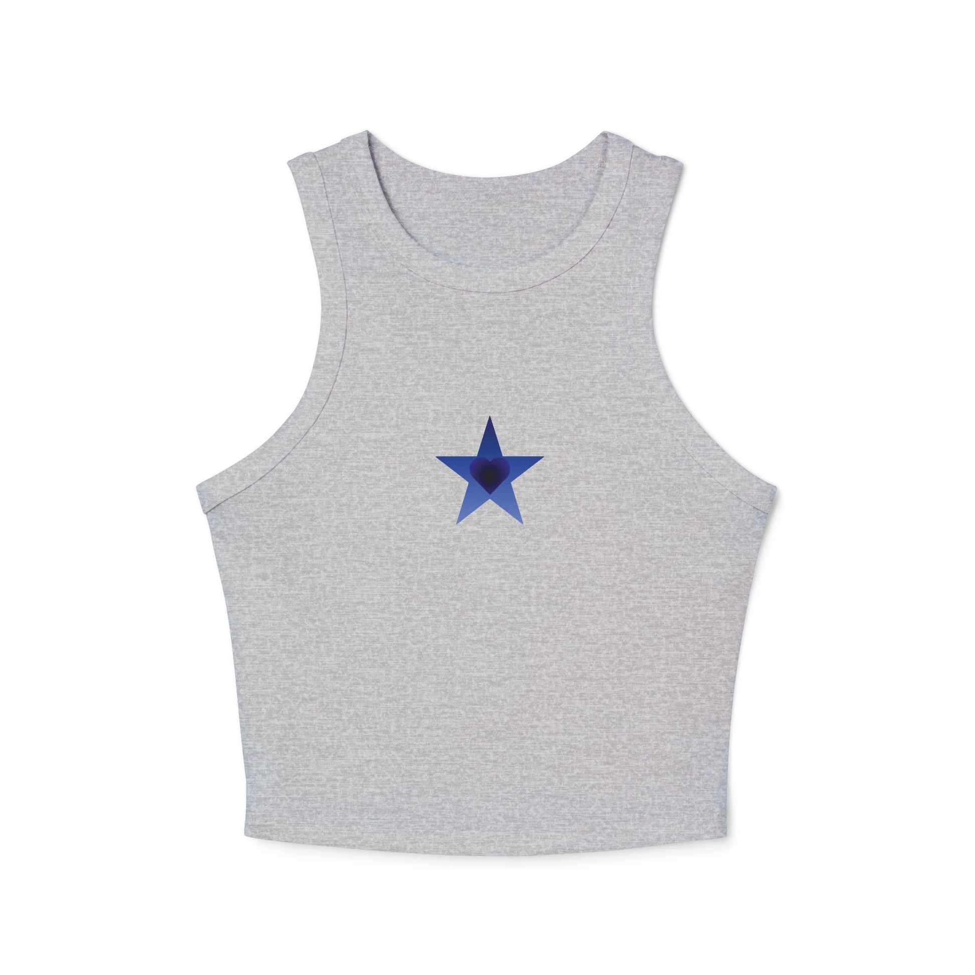 A sleek micro-rib racer tank with a bold blue star print — light, fitted, and effortlessly cool. The high neckline and mid-length cut create a modern silhouette that layers naturally under jackets or stands alone on warm days. The micro rib texture adds subtle stretch and structure, while the soft Airlume combed cotton blend keeps the fabric breathable and smooth against skin. The deep-blue star graphic adds a touch of playful confidence for days when you want simple, striking style. Lightweight and tailored, it moves with you from coffee runs to sunset walks without fuss.