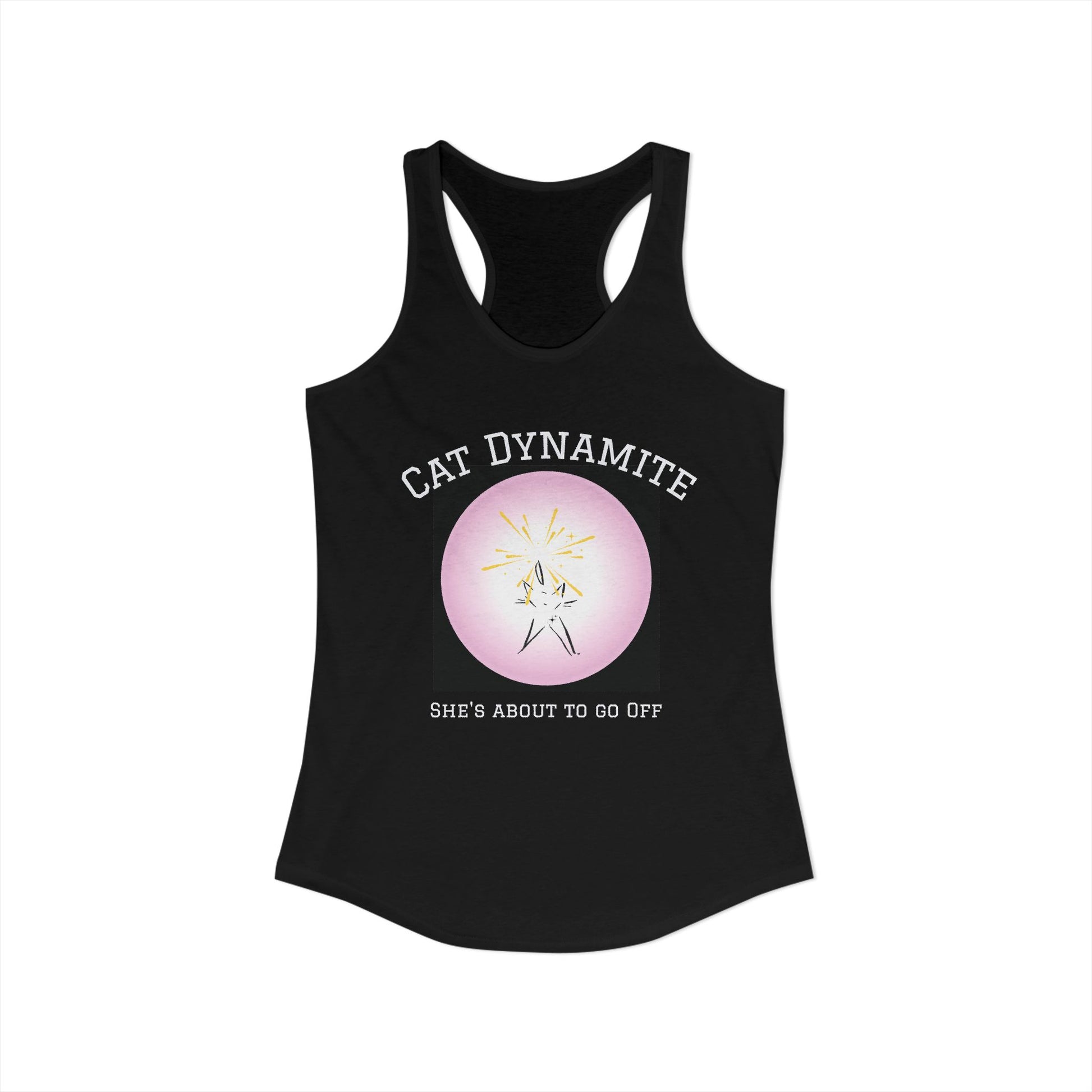 Cat Dynamite graphic tank—pink circle on black