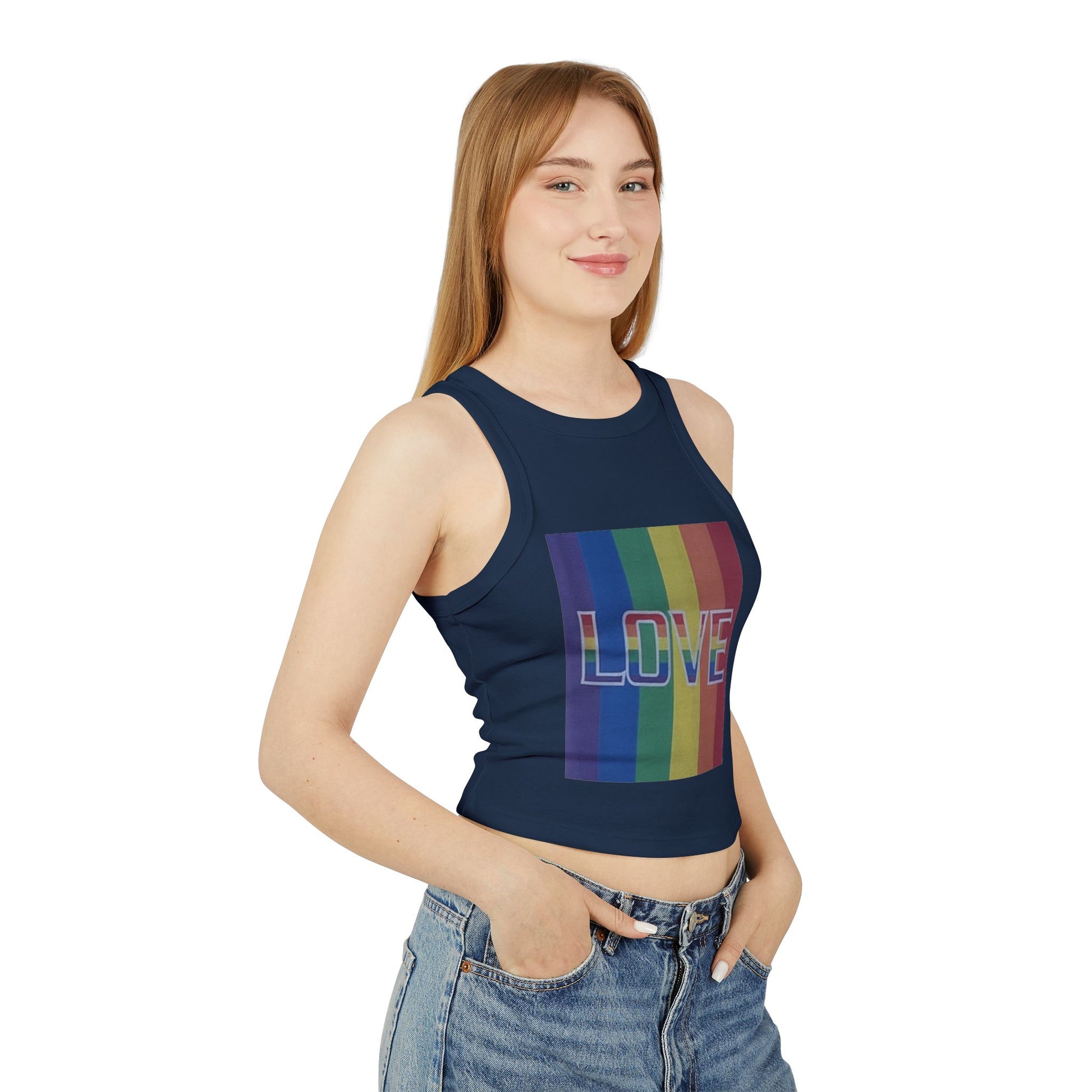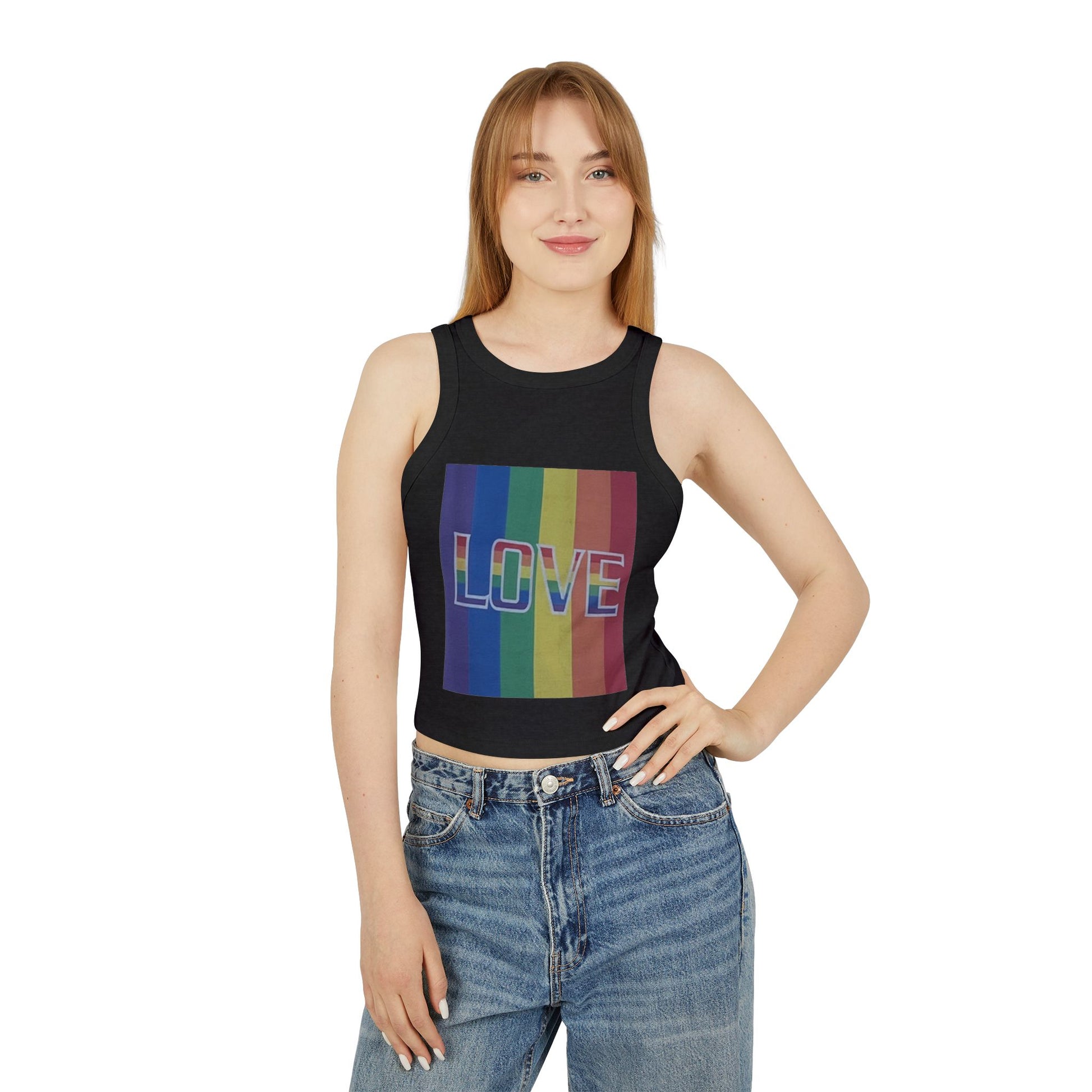 Lightweight and confidently cut, this micro-rib racer tank brings quiet attitude to warm days and layered looks. The high neckline and mid-length silhouette feel modern and streamlined, while the fitted stretch and soft Airlume combed cotton blend move with you. A bold vertical rainbow graphic with the word "LOVE" printed via DTF adds an upbeat, expressive pulse—wear it to rallies, rooftop hangs, or weekend markets. Tear-away label keeps the back of your neck comfortable, and the micro-rib finish gives a subtle texture that reads elevated whether paired with high-waist denim or layered under an open button shirt.