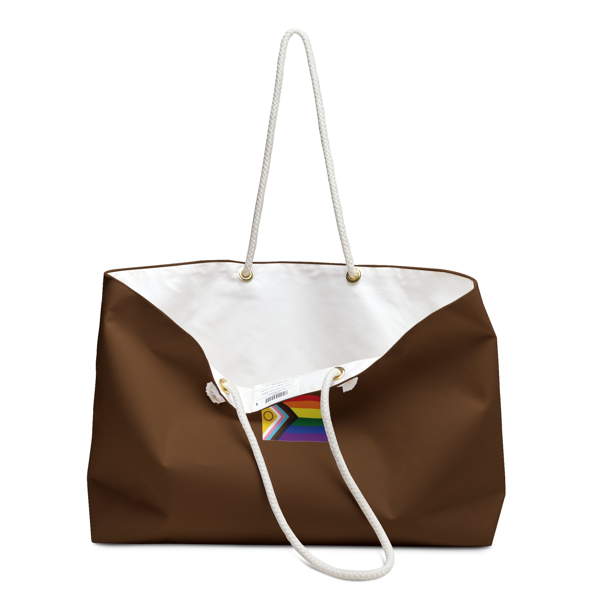 This roomy weekender bag features a Pride flag because representation belongs everywhere, even on your carryon. From quick city getaways to beach mornings and overnight visits with friends, the spun-polyester exterior resists wrinkles so the bag keeps a clean look. Cream rope handles slide over the shoulder comfortably, and gold-tone grommets add a subtle, nautical nod. Inside, a soft cream sheeting lining and a structured T-bottom keep essentials organized without fuss.