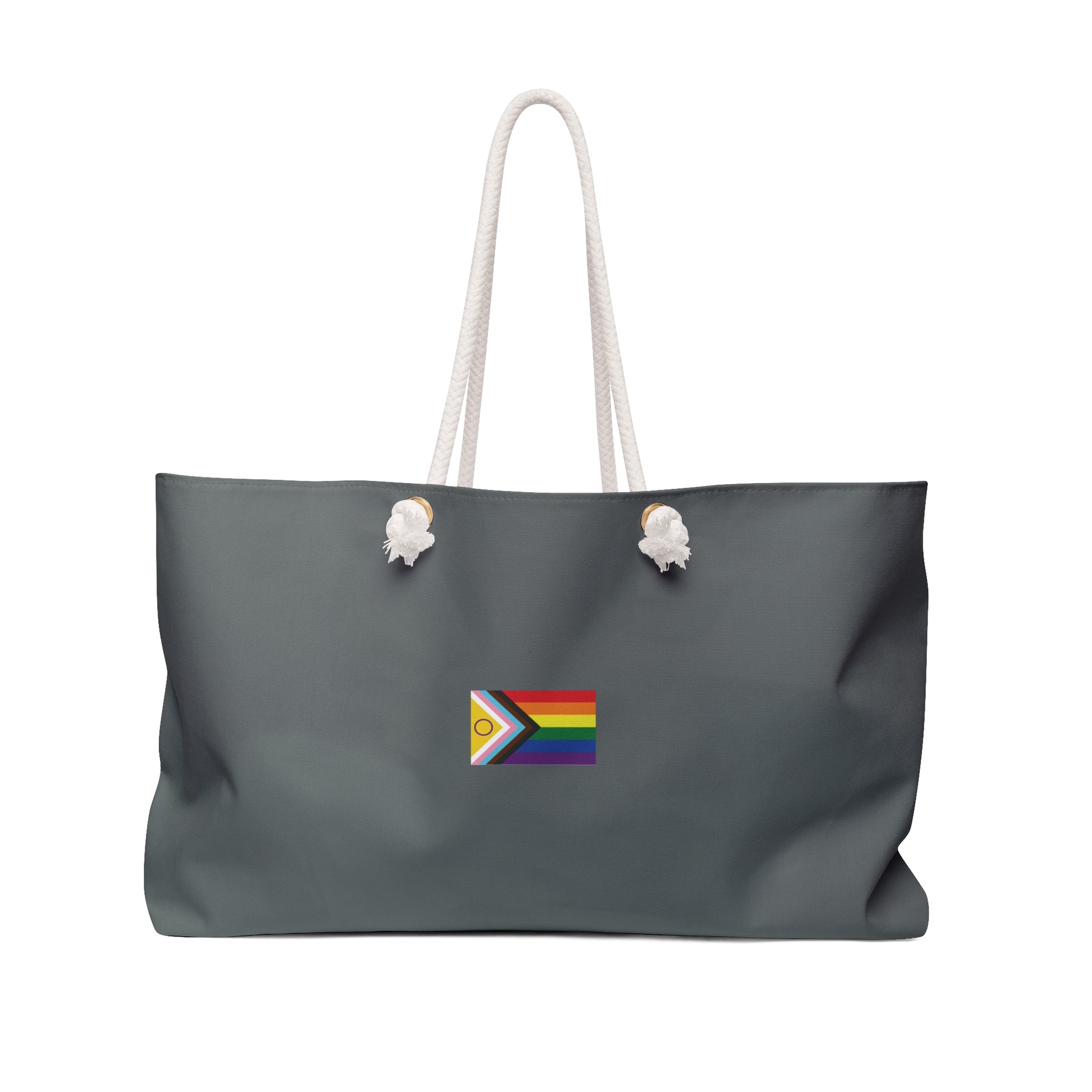 This roomy weekender bag features a Pride flag because representation belongs everywhere, even on your carryon. From quick city getaways to beach mornings and overnight visits with friends, the spun-polyester exterior resists wrinkles so the bag keeps a clean look. Cream rope handles slide over the shoulder comfortably, and gold-tone grommets add a subtle, nautical nod. Inside, a soft cream sheeting lining and a structured T-bottom keep essentials organized without fuss.