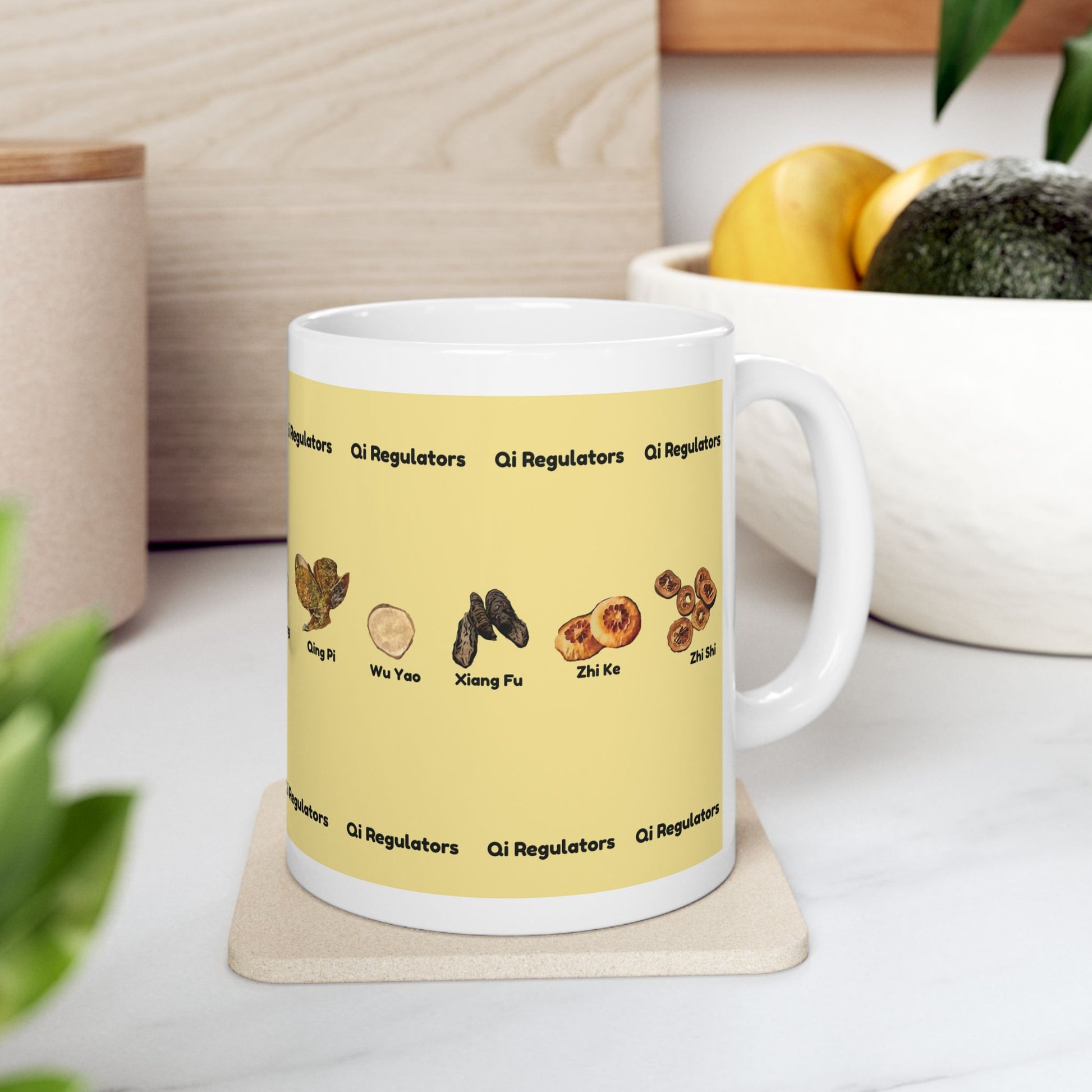 Give your qi a friendly little nudge! Featuring illustrations of qi-moving herbs like Chen Pi, Xiang Fu, Chen Xiang, and Zhi Ke, this mug keeps the good feelings flowing.