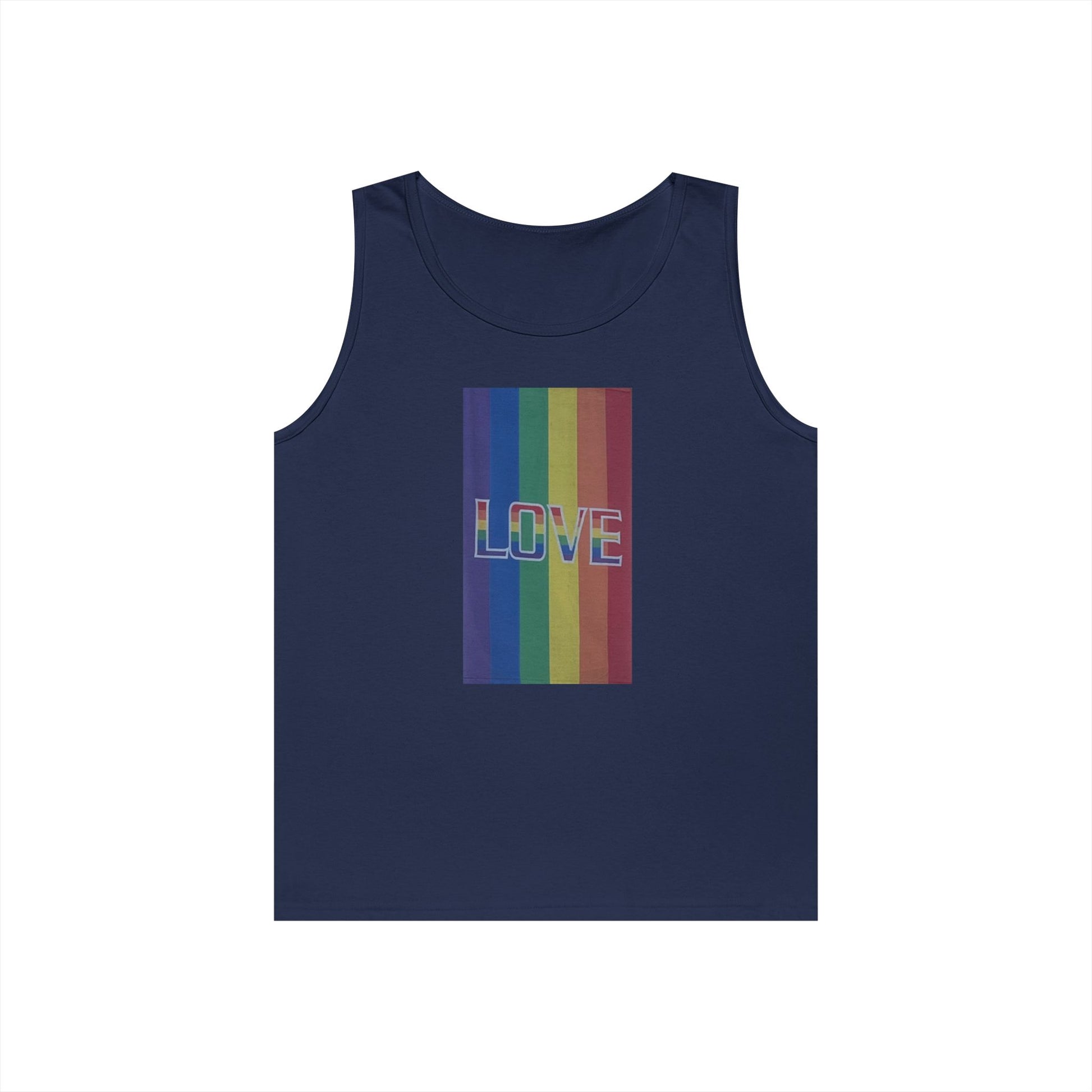 Vertical rainbow block print with the word “LOVE” set in a slightly distressed outline. The medium-weight cotton feels sturdy but breathable. The classic cut keeps movement easy, while the ribbed collar and reinforced hem hold their shape through repeated wears and washes.