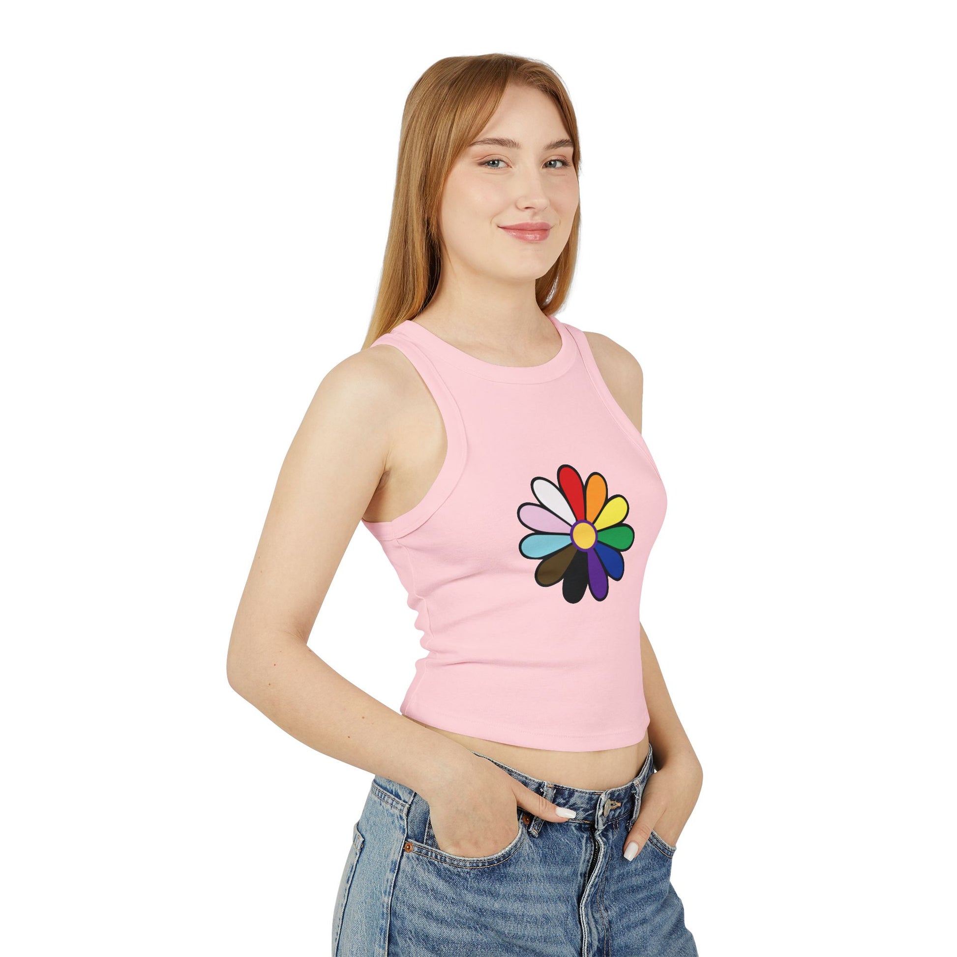 Rainbow Pride Daisy Racer Tank Top — Inclusive Flower Graphic Women's Tank