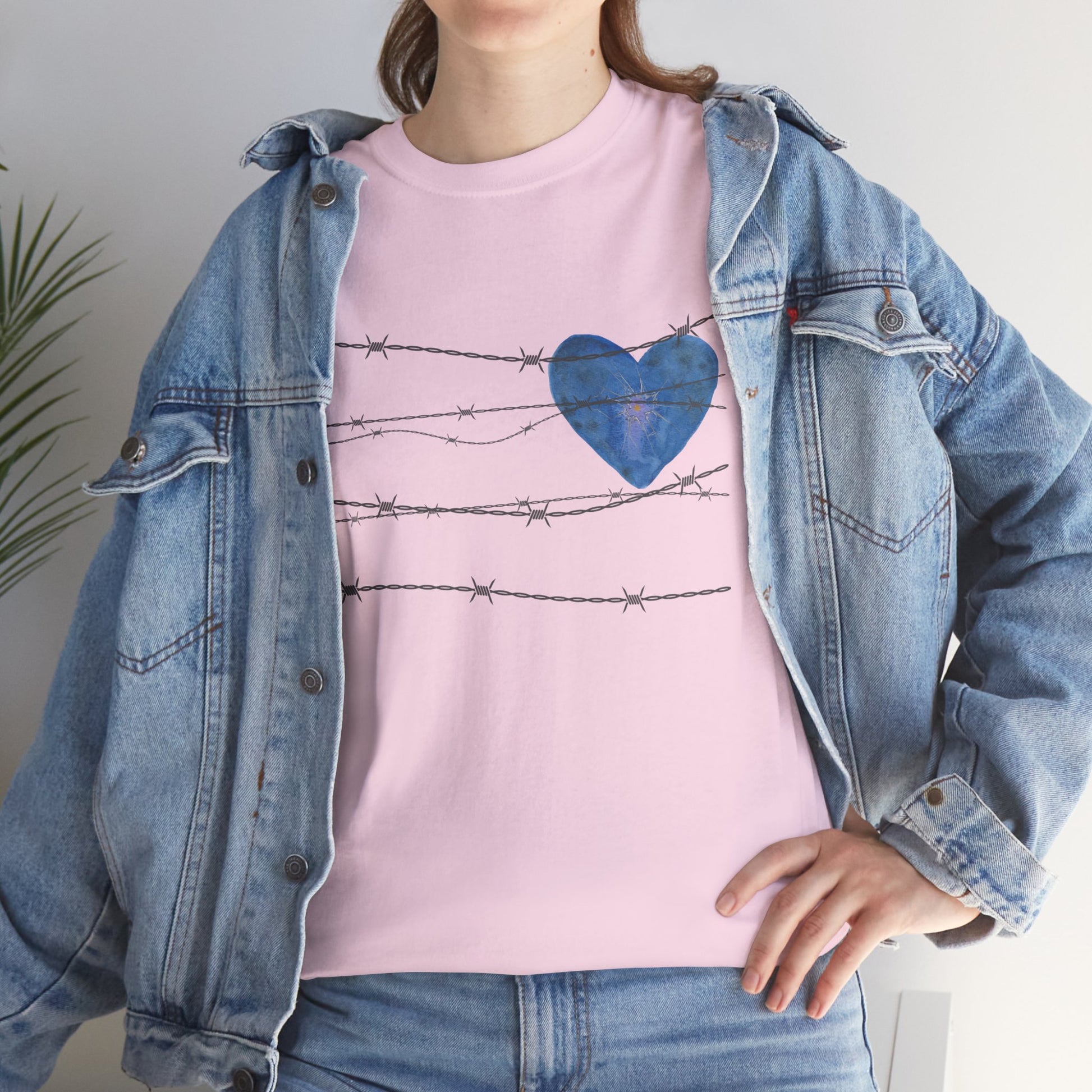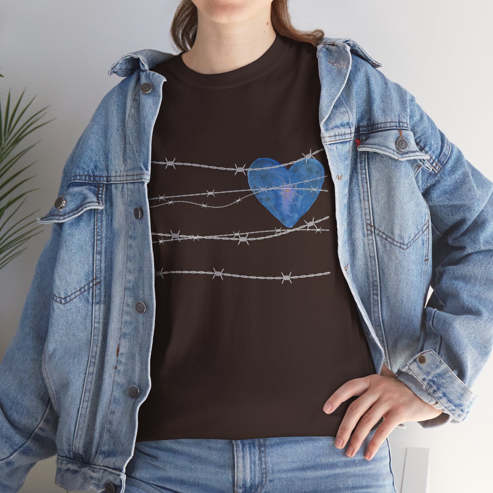 Soft, sturdy, and quietly expressive — this classic crew tee puts a hand-painted blue heart behind a line of barbed wire, a tender contrast that speaks to resilience and rebellion.